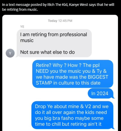 “I am retiring from professional music. Not sure what else to do,” read a text from the rapper, whose real name is Ye, according to Uproxx. Rich The Kid pushed back against West’s retirement plans, urging him to release the second installment of his and Ty Dolla $ Ign’s collaborative album, titled Vultures 2.