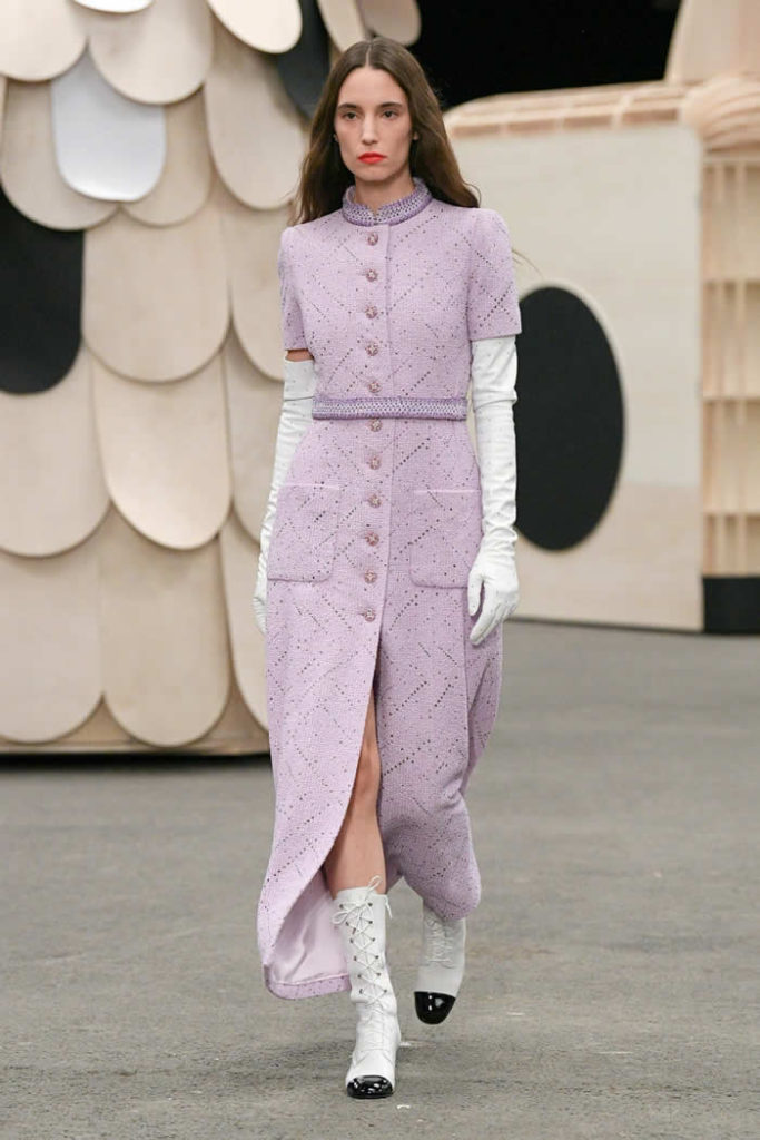 Proceeding “not too obviously” might actually be Viard’s motto. So it was when the collection switched from short and sweet daywear to long and slim evening. Within this sequence, there was a chic, neat, parma-violet short-sleeved tweed coat, worn with white leather opera gloves, long, body-skimming dresses in tiny polka dots, and black or white lace.