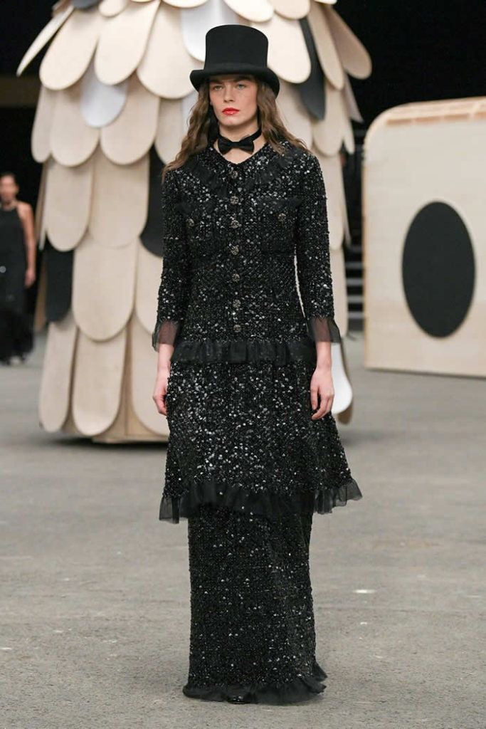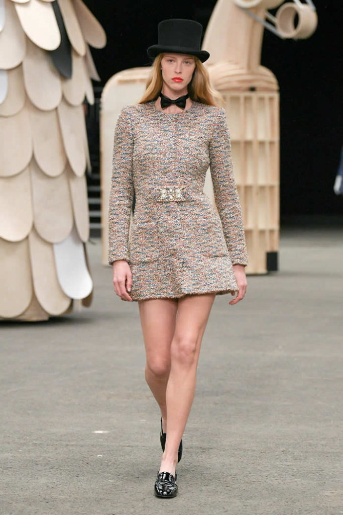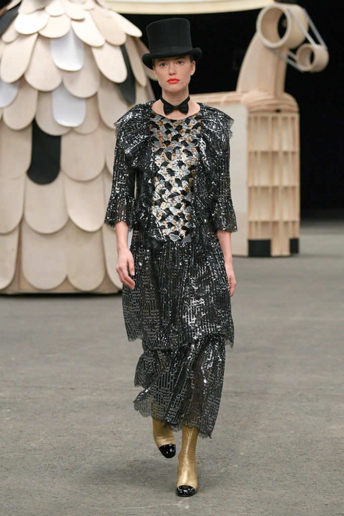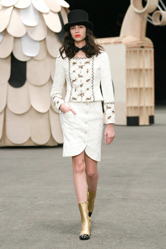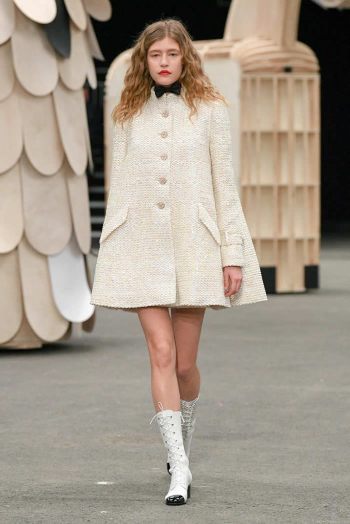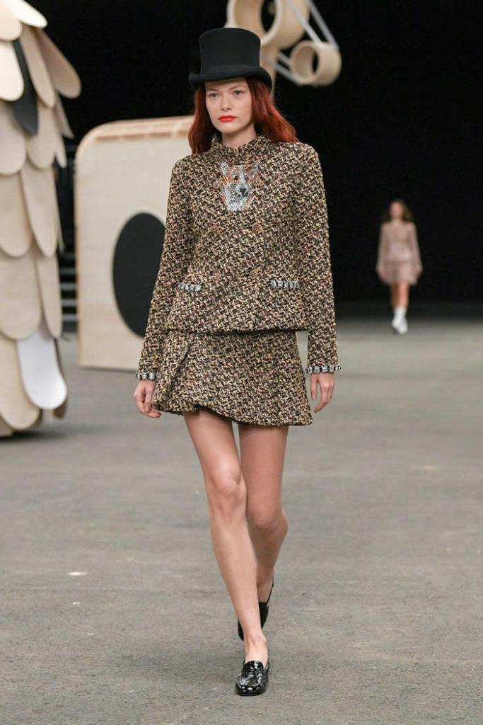 Hey, presto! A playful idea that got Viard into the swing of a theme—a parade of something between cute Chanel drum majorettes, or perhaps, circus ringmasters. They flipped along in their short, flared suits with the odd top hat and bow tie, shod in little white cross-laced boots with Chanel’s signature black-tipped toes. By this time, they were walking around Veilhan’s menagerie of mobile animal sculptures—a horse, lion, deer, buffalo, bird, fish, dog, and elephant—which had been trundled out to join the camel.