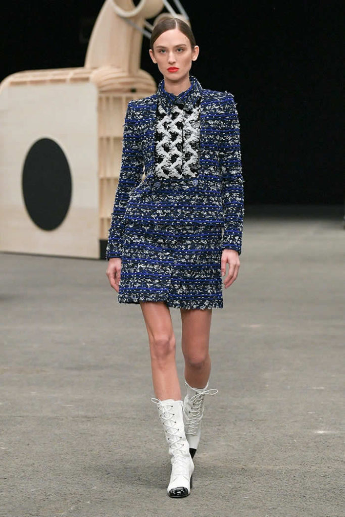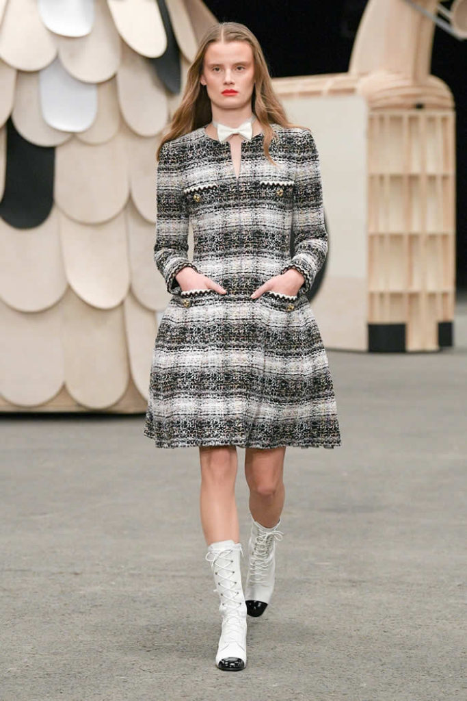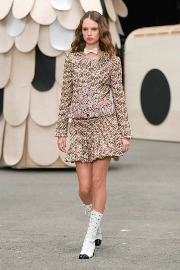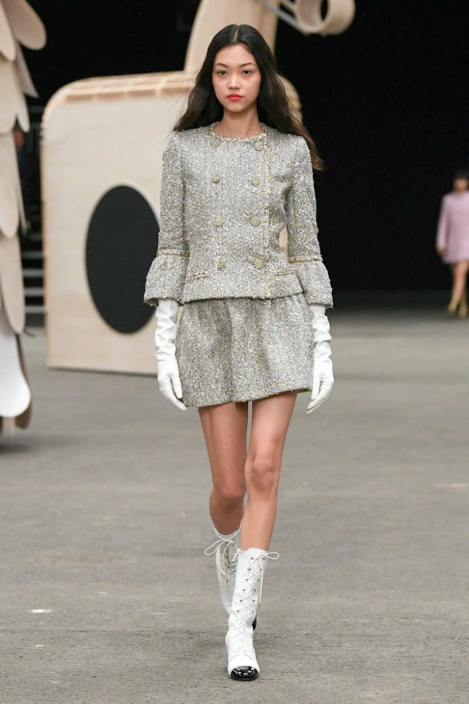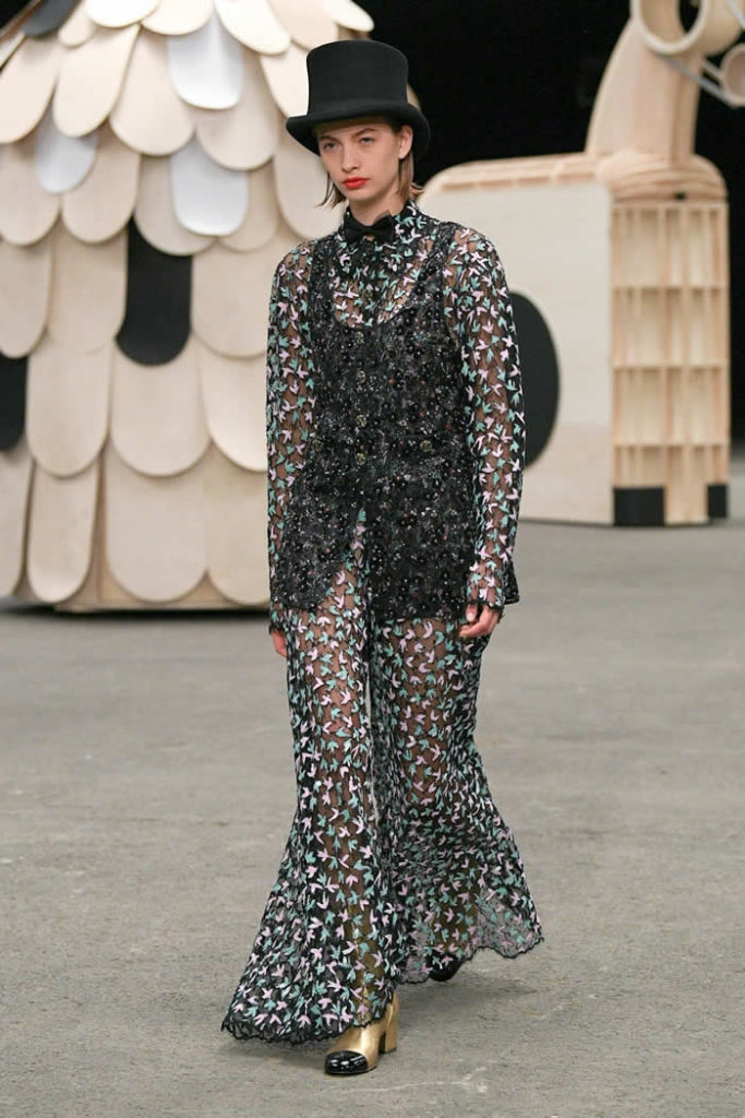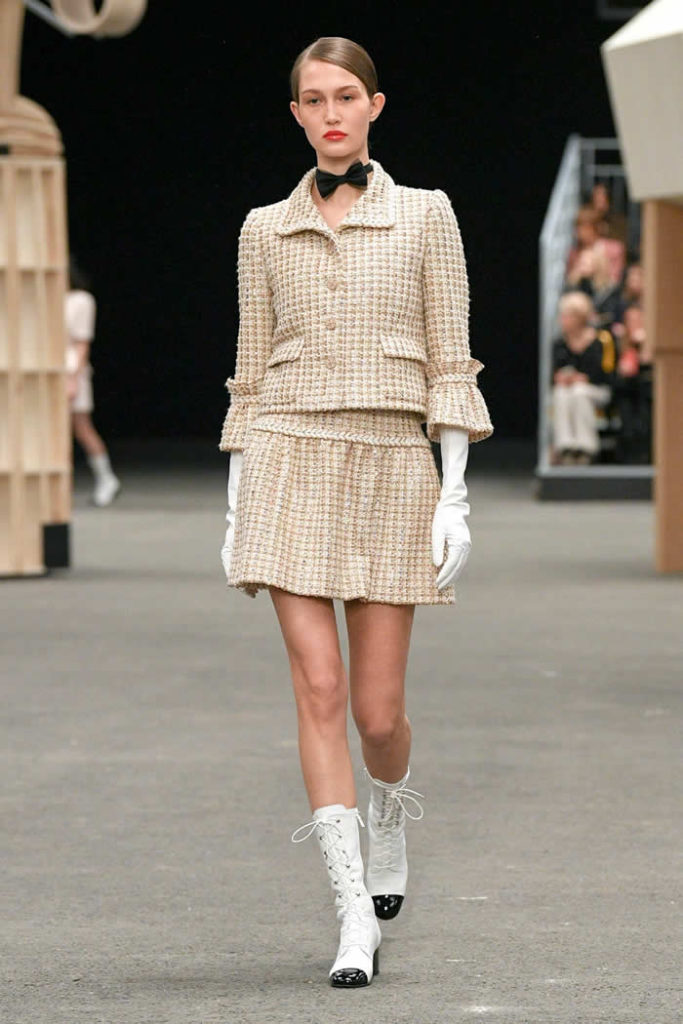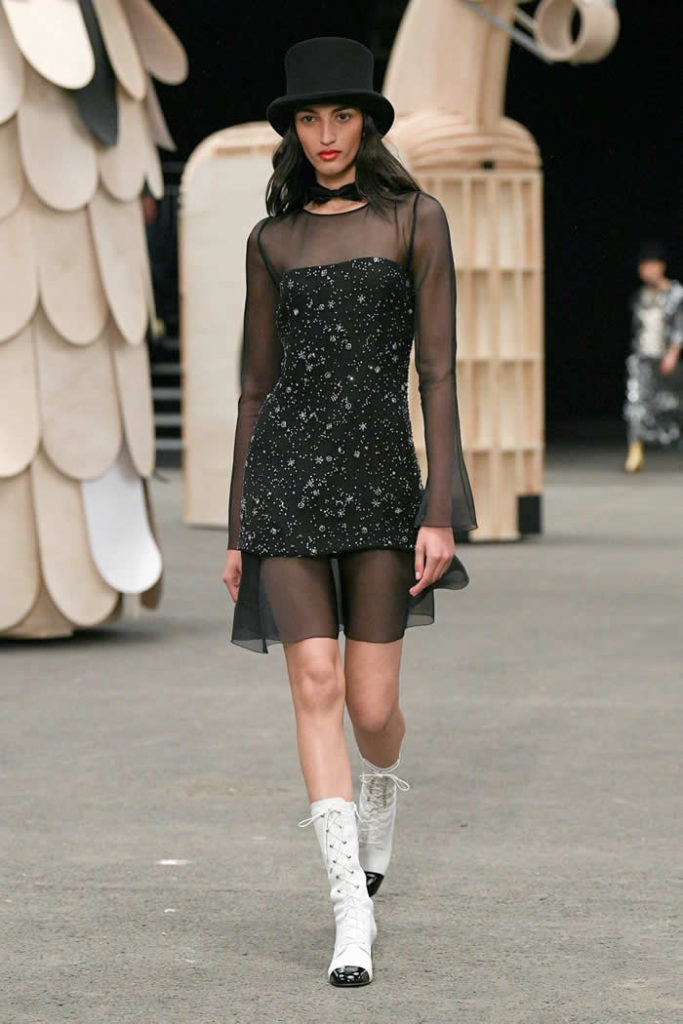 Hey, presto! A playful idea that got Viard into the swing of a theme—a parade of something between cute Chanel drum majorettes, or perhaps, circus ringmasters. They flipped along in their short, flared suits with the odd top hat and bow tie, shod in little white cross-laced boots with Chanel’s signature black-tipped toes. By this time, they were walking around Veilhan’s menagerie of mobile animal sculptures—a horse, lion, deer, buffalo, bird, fish, dog, and elephant—which had been trundled out to join the camel.