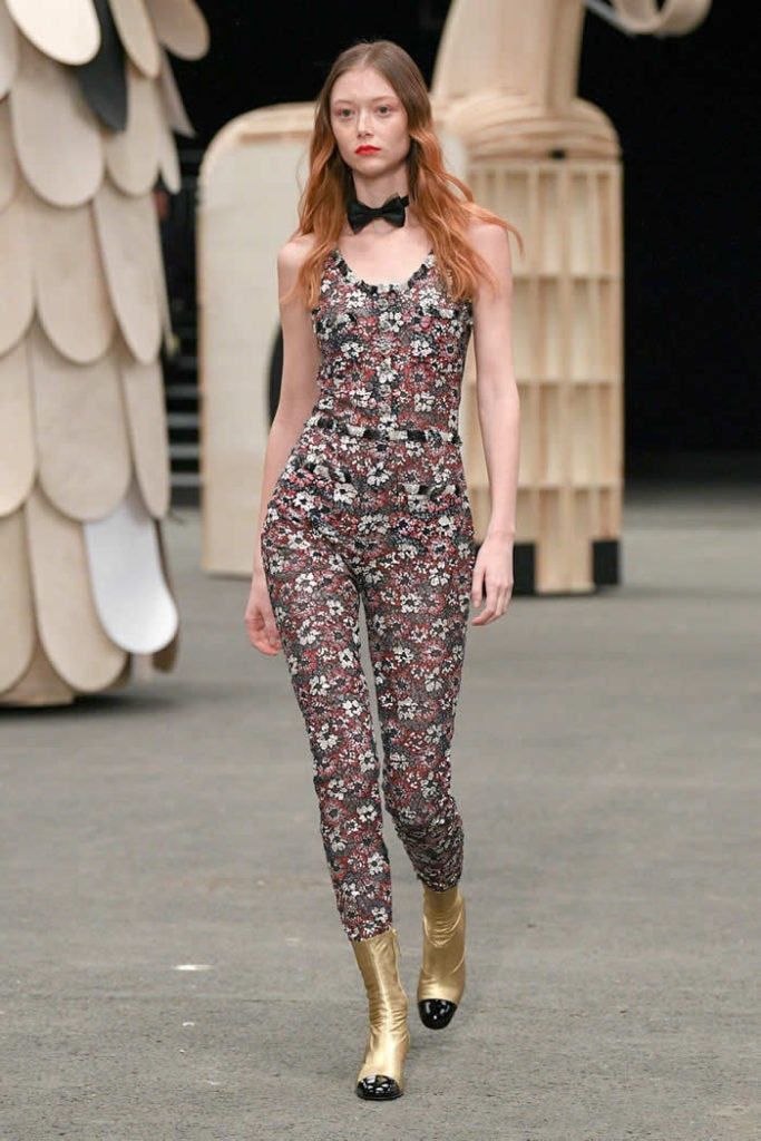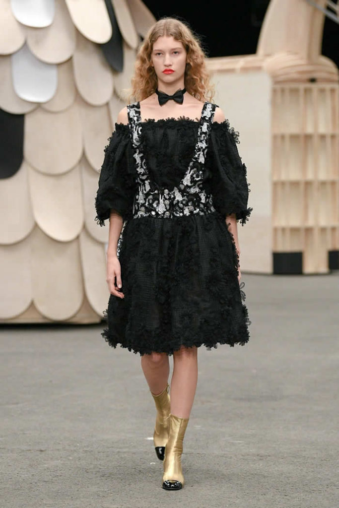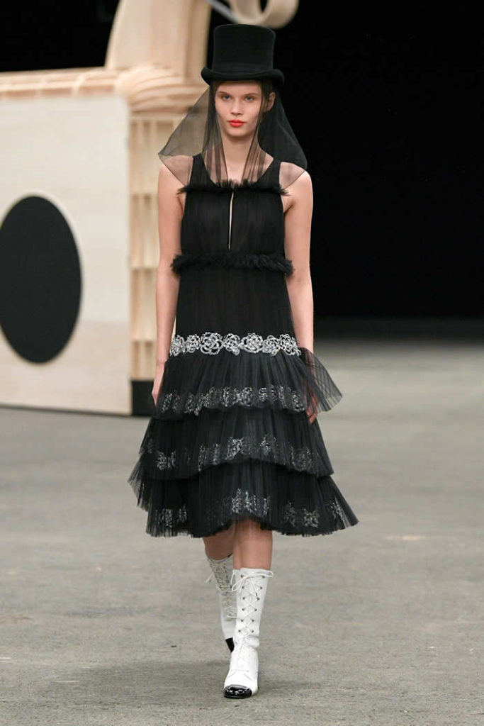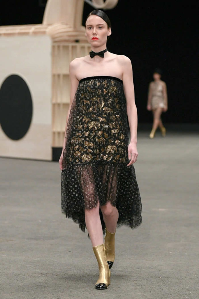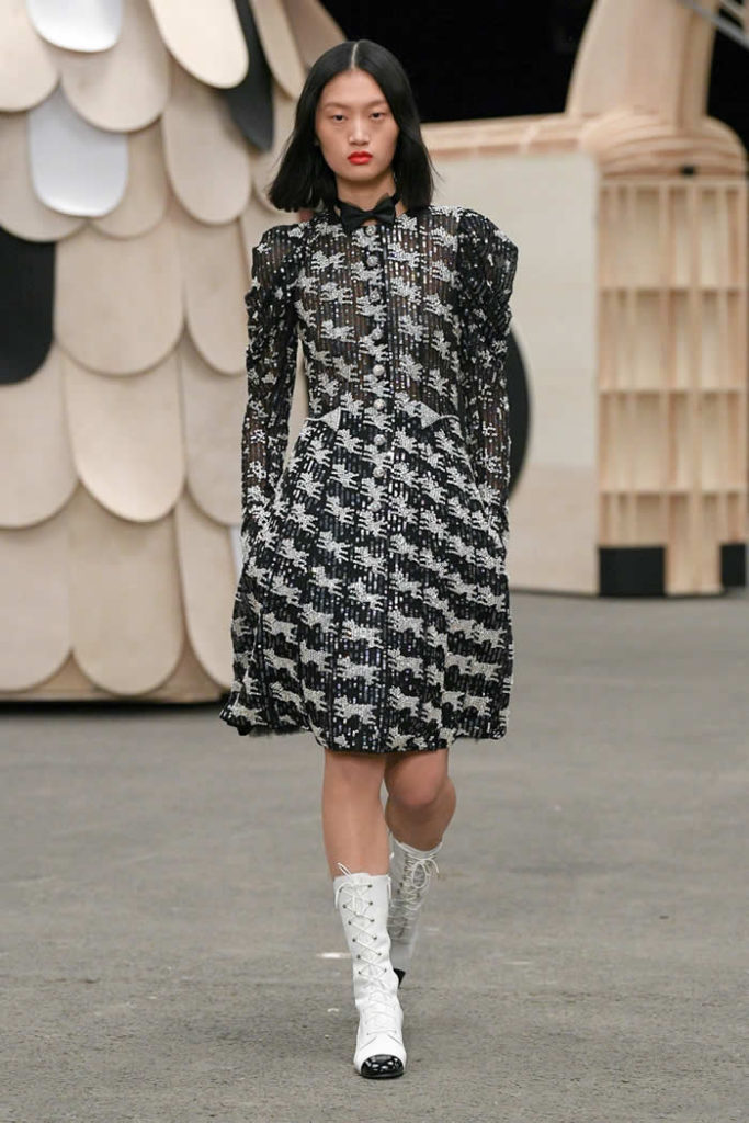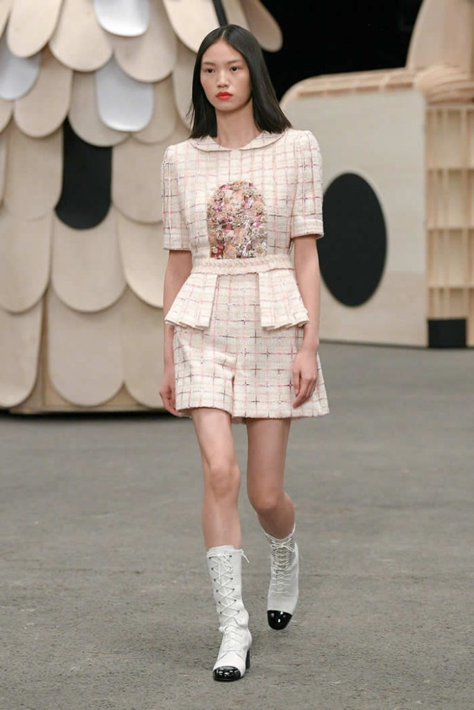 Hey, presto! A playful idea that got Viard into the swing of a theme—a parade of something between cute Chanel drum majorettes, or perhaps, circus ringmasters. They flipped along in their short, flared suits with the odd top hat and bow tie, shod in little white cross-laced boots with Chanel’s signature black-tipped toes. By this time, they were walking around Veilhan’s menagerie of mobile animal sculptures—a horse, lion, deer, buffalo, bird, fish, dog, and elephant—which had been trundled out to join the camel.