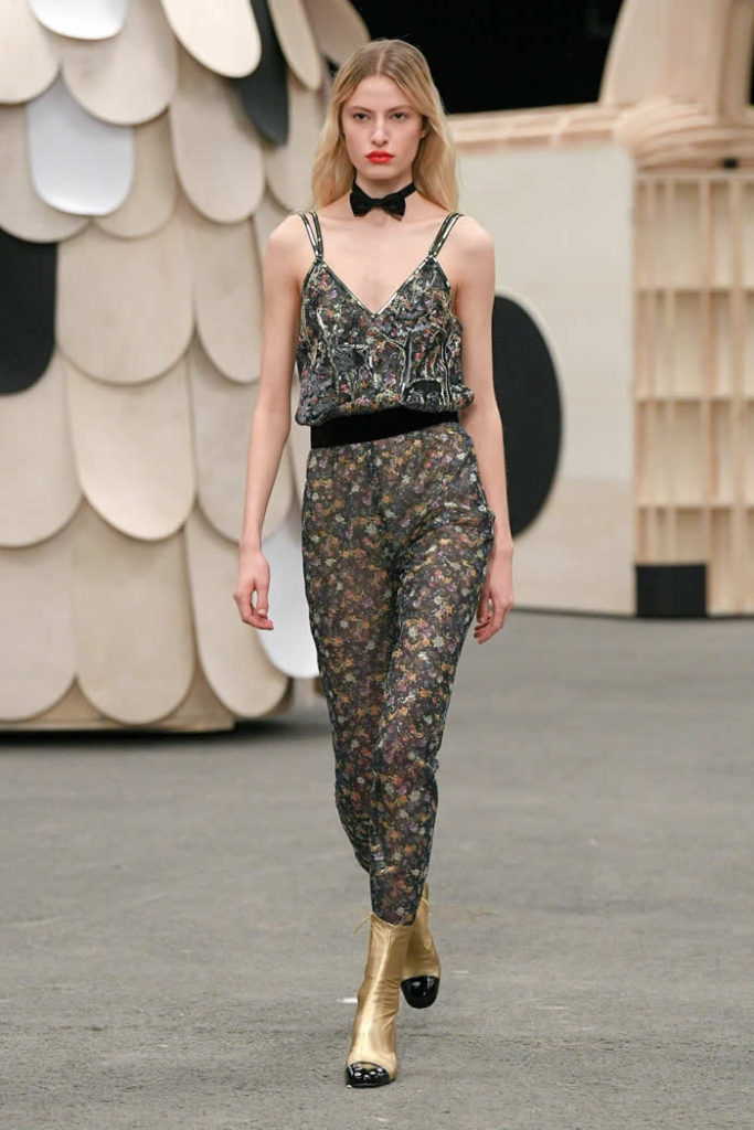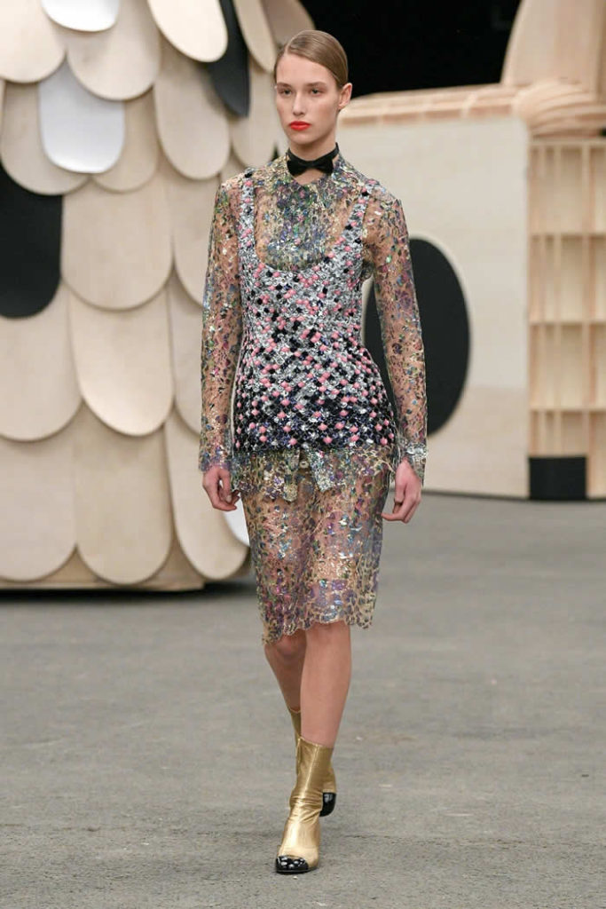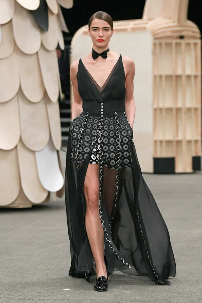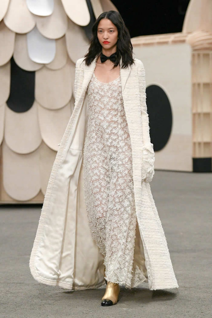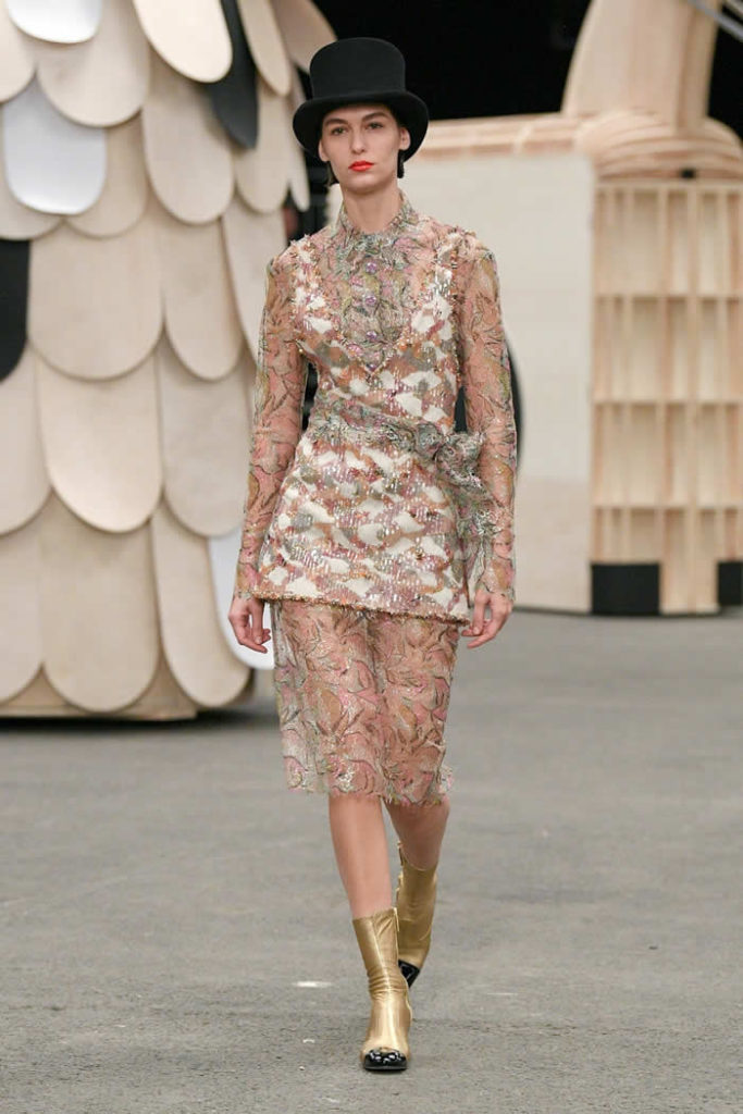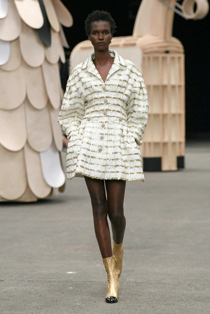 What could a conceptual camel be doing at Chanel couture? This puzzle—the first sight to greet the audience as they walked in—can easily be solved by googling Coco Chanel’s apartment. What swiftly comes up are photos of Chanel at home in the Rue Cambon, with a model of a camel on a side table, a large bronze of deer clustered around her fireplace, and lion effigies here, there, and everywhere. Virginie Viard held a tete-a-tete with the artist Xavier Veilhan to come up with a set idea for the spring couture show in the said apartment and—you can picture it—they must’ve looked around and said to each other “let’s do the animals!”
