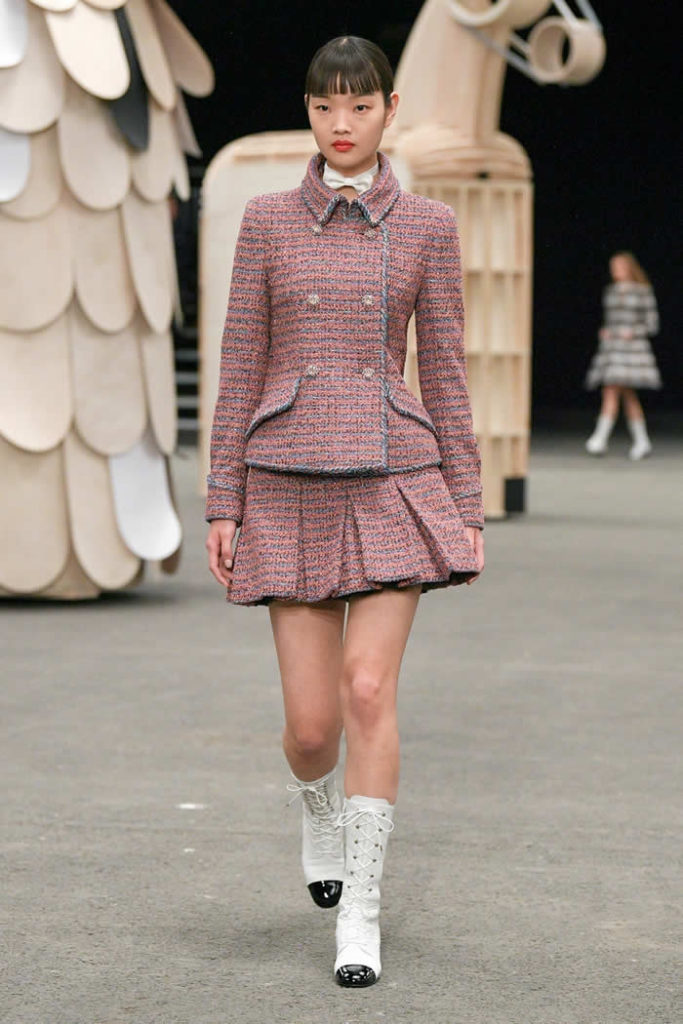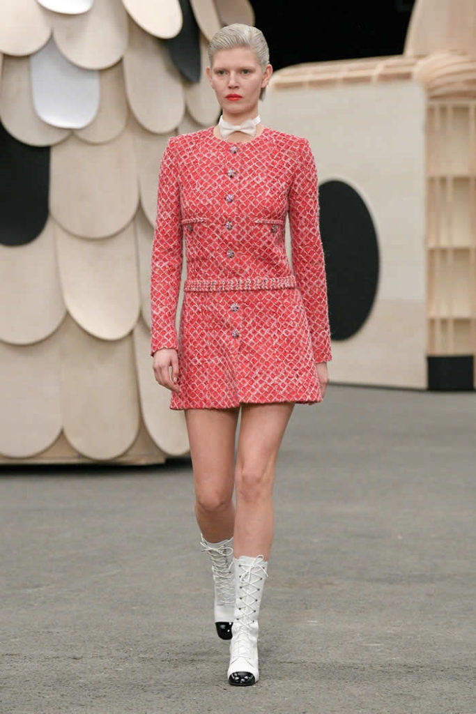 That was followed by varieties of abbreviated, gilded Chanel tweeds: a short trapeze coat, de-fructified box-pleated skirts cut as minis, and then a tiny sugar-pink coat-dress with a stand-away collar. It was a bit of ’60s Mod maybe, but not too obviously.
