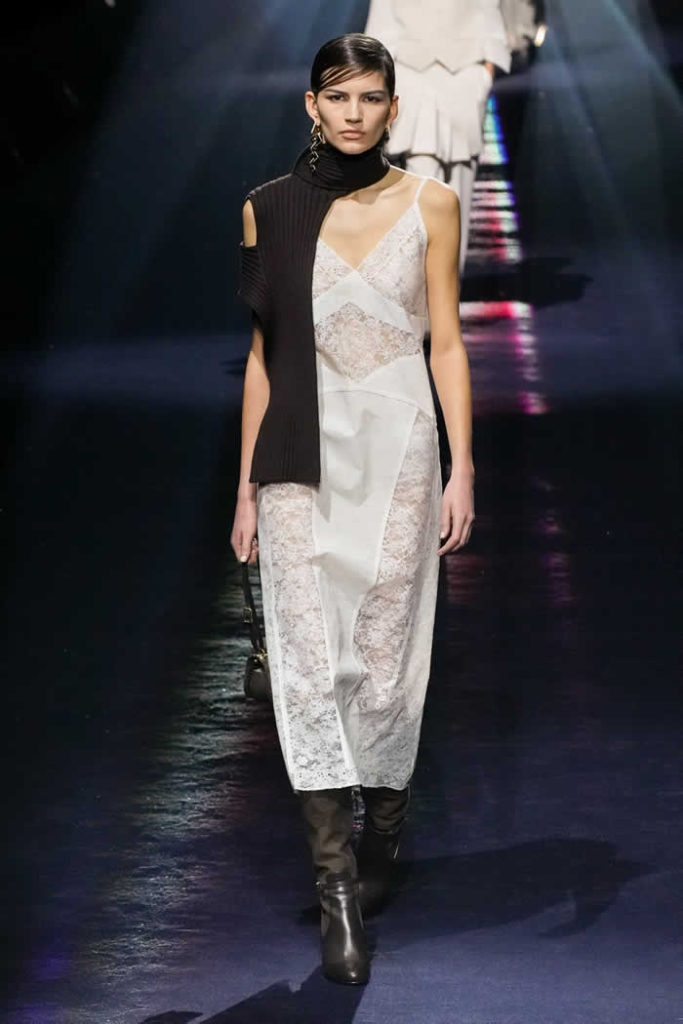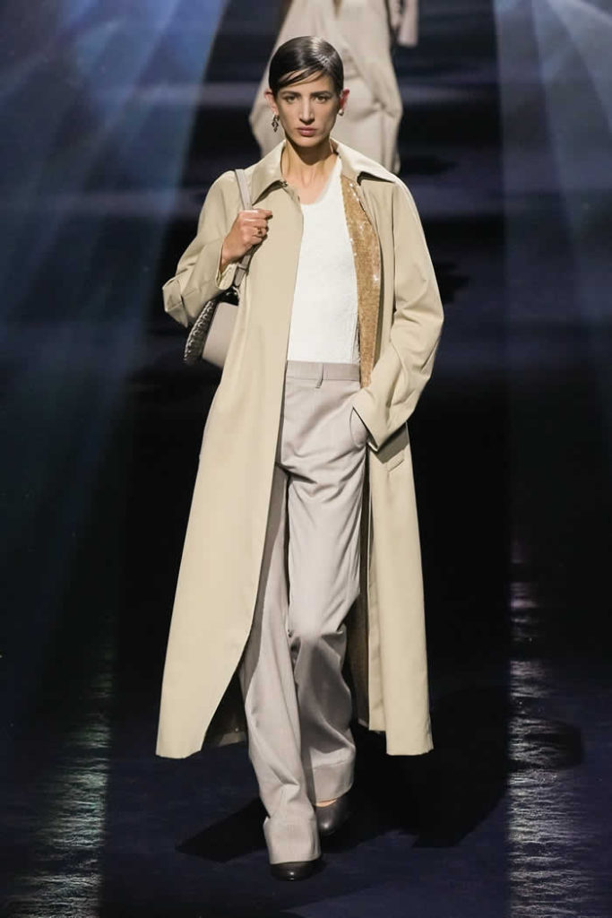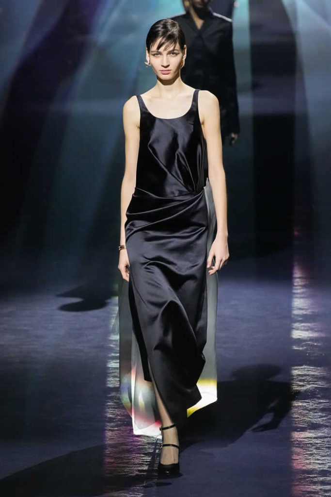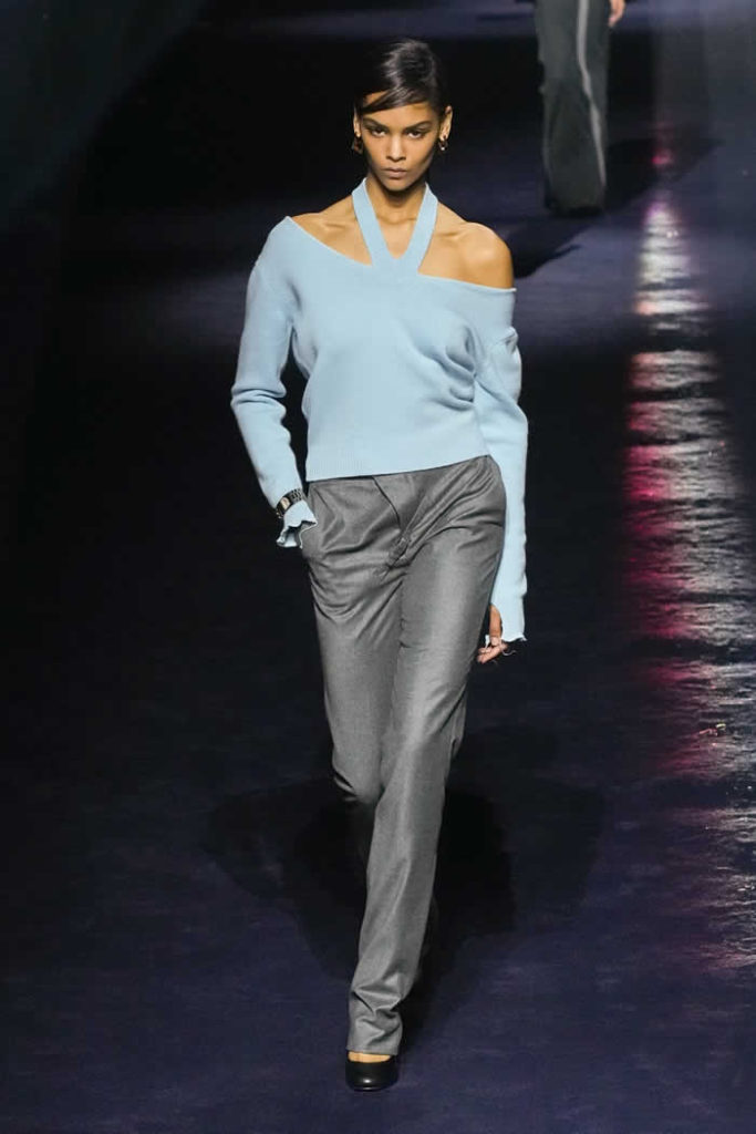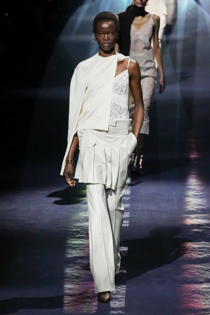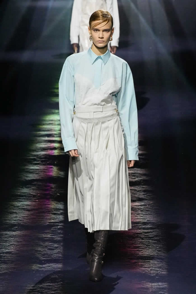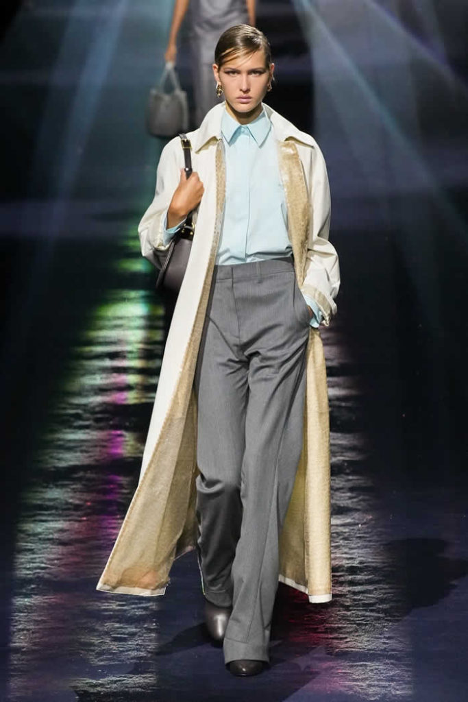 The first element involved incorporating menswear fabrics and shapes into the sophisticatedly feminine dressing, such as bias-cut pants and backless waistcoats with open-shoulder sleeves, mac-shaped jackets, and double-collared jacketing. The second element drew from Jones’s couture output for the house, with details such as sequin-lined mackintoshes and pressed lingerie applied to cotton shirting or worn as a mid-layer.