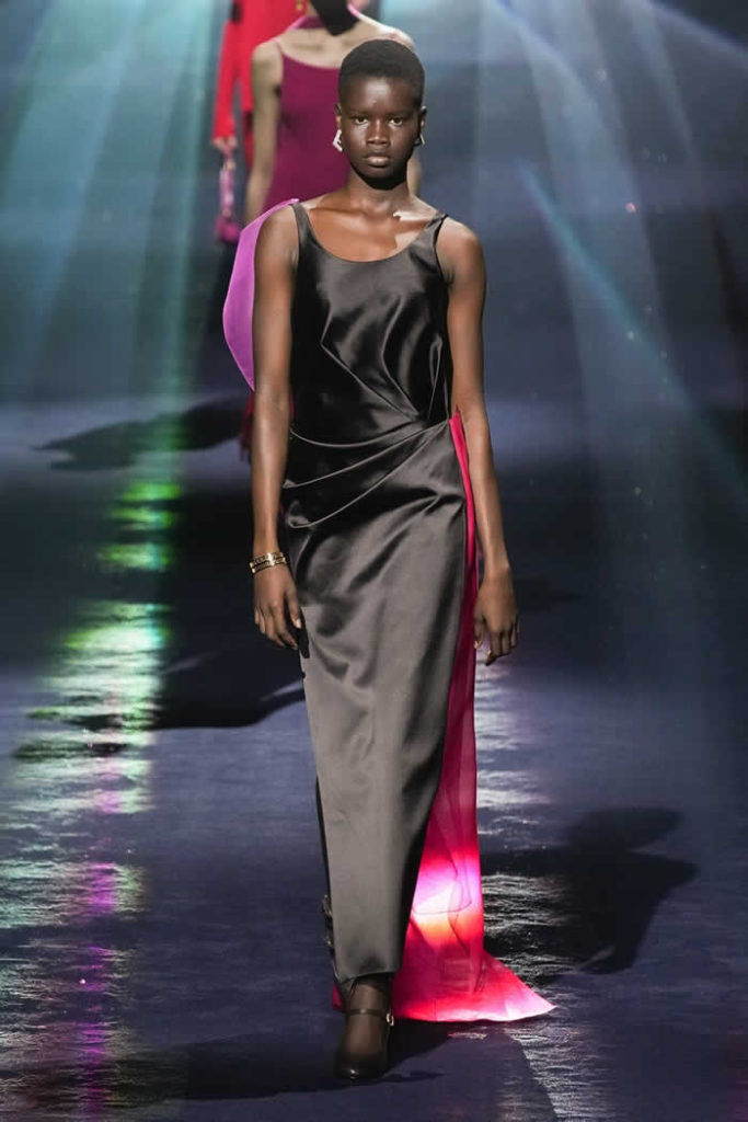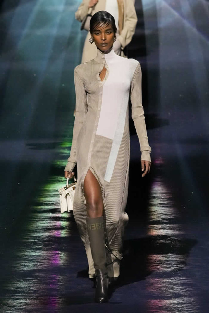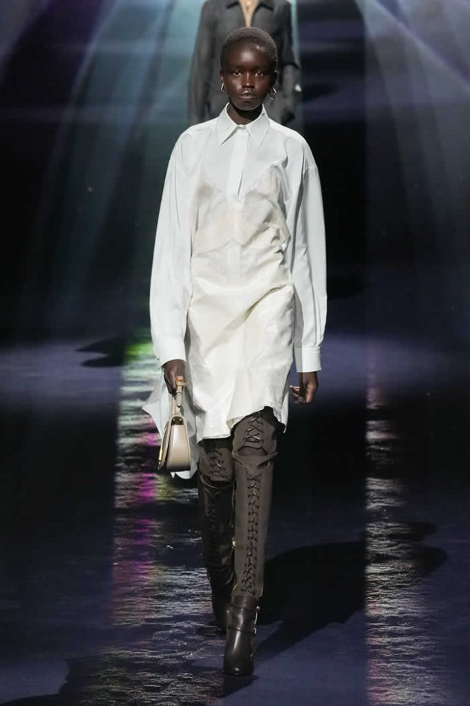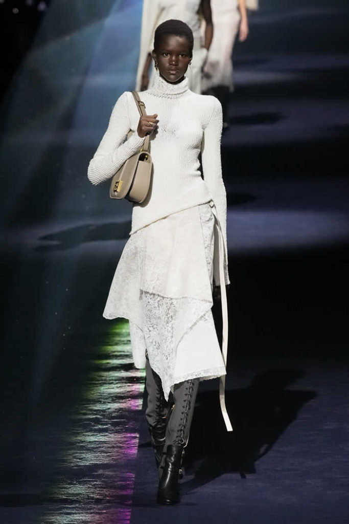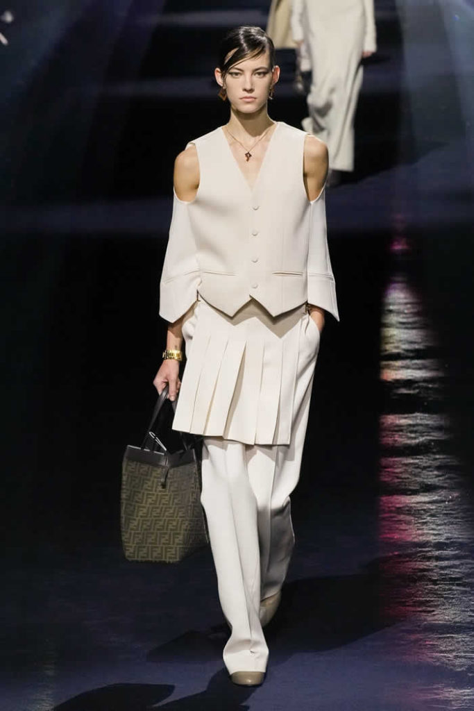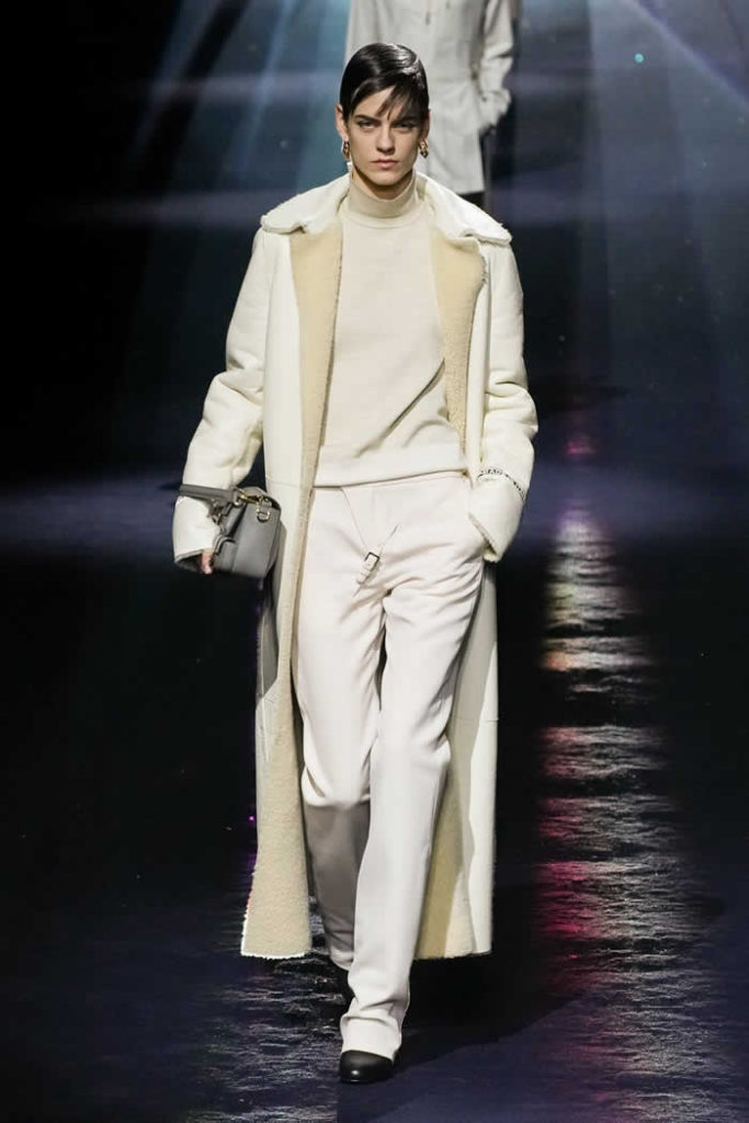 Silvia Fendi described the Kim Jones-authored Fendi collection as “pure, simple, but complex.” During a pre-show chat, Jones briefly stepped away to showcase new accessories, including the many-pocketed Baguette and the Multi, a versatile bag that can transform from a day tote to an evening bag with one easy fold.