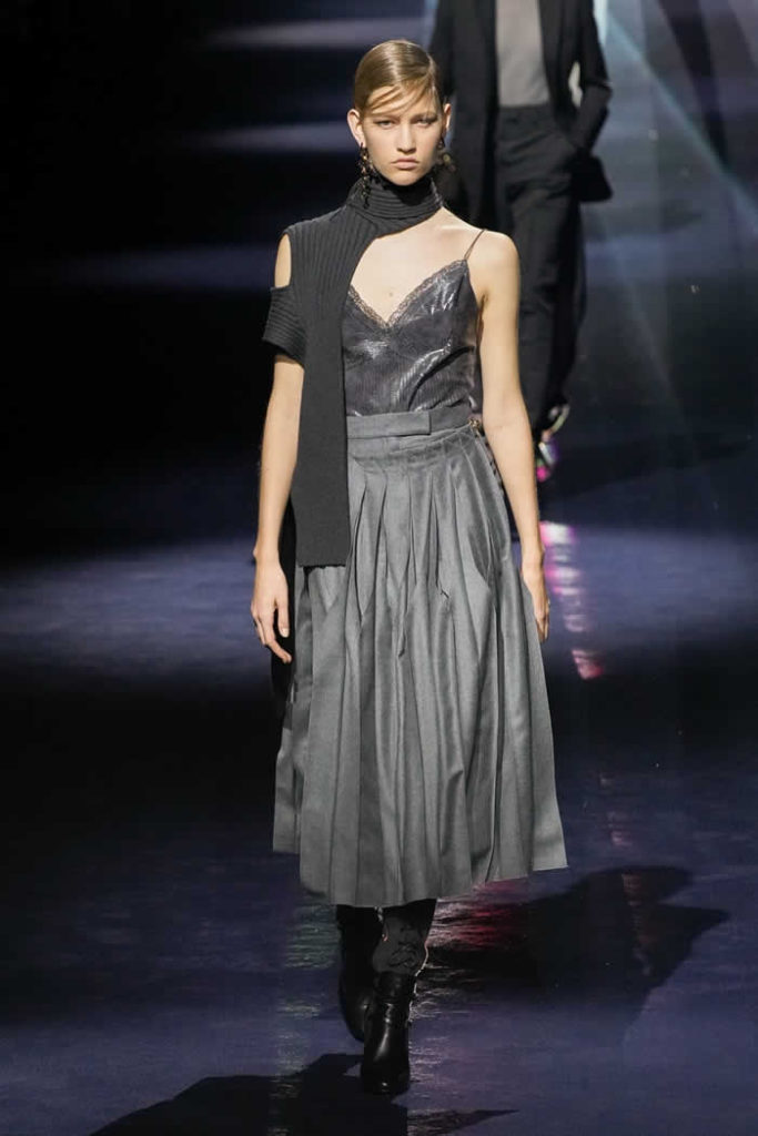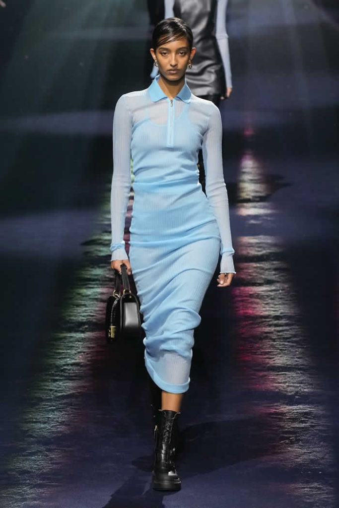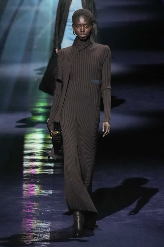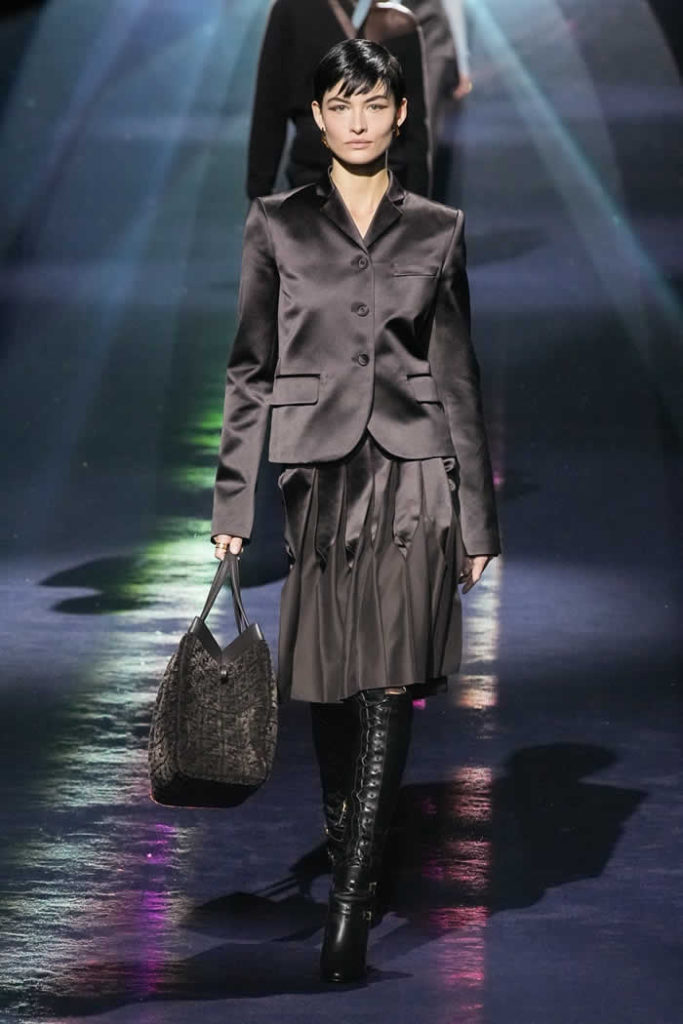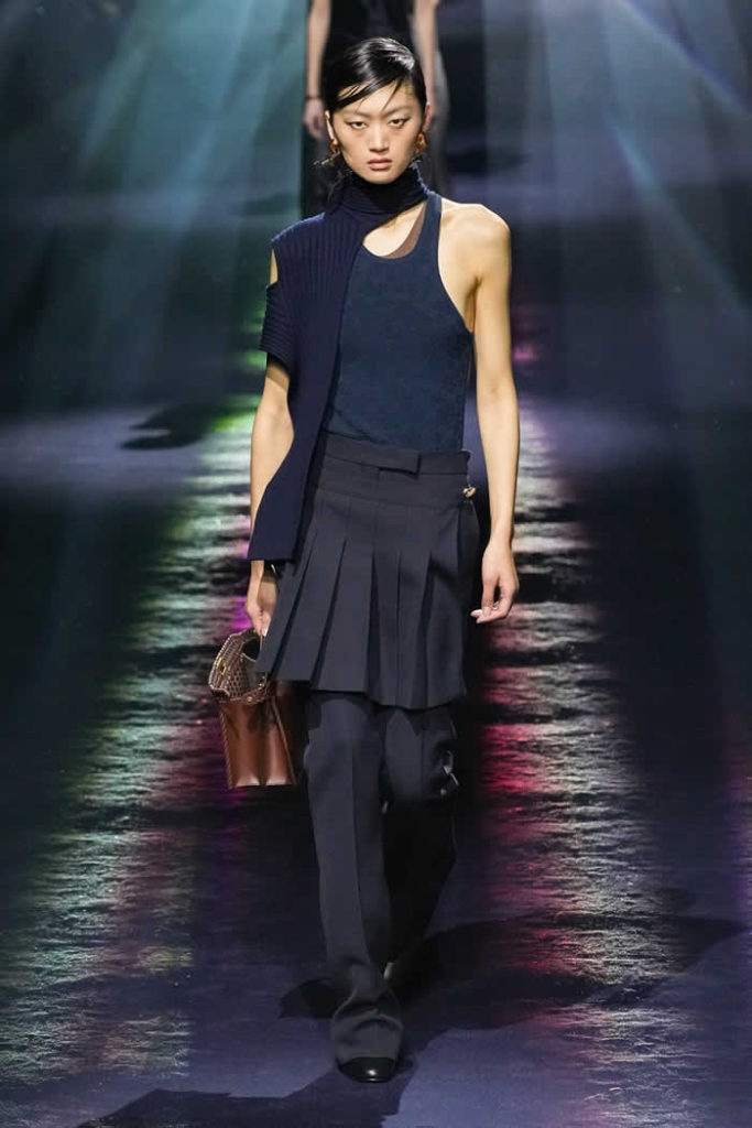 The third ingredient was inspired by Delfina Delettrez Fendi’s personal style, including her interesting combination of brown and pale blue, reflected in the multi-length pleated kilts and black satin suiting. The fourth and final element was the triple-yarned, ribbed knits drawn from Karl Lagerfeld’s fall 1996 collection for the house, contributing to the overall vision of a sophisticated Italian woman with global appeal.