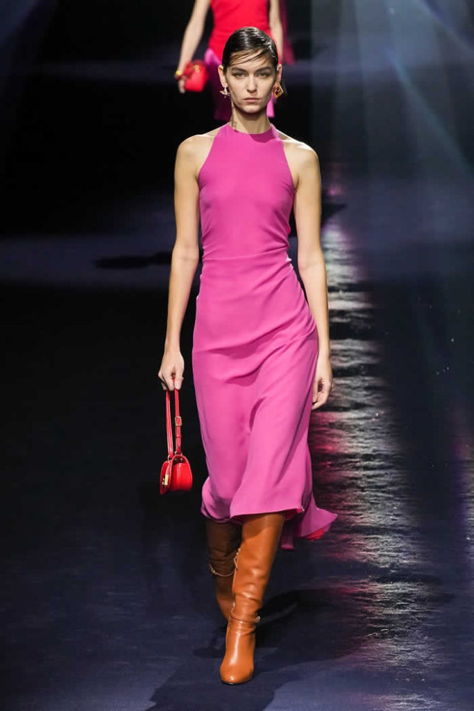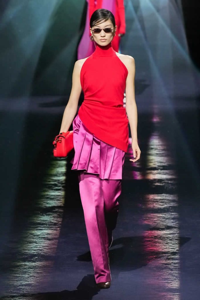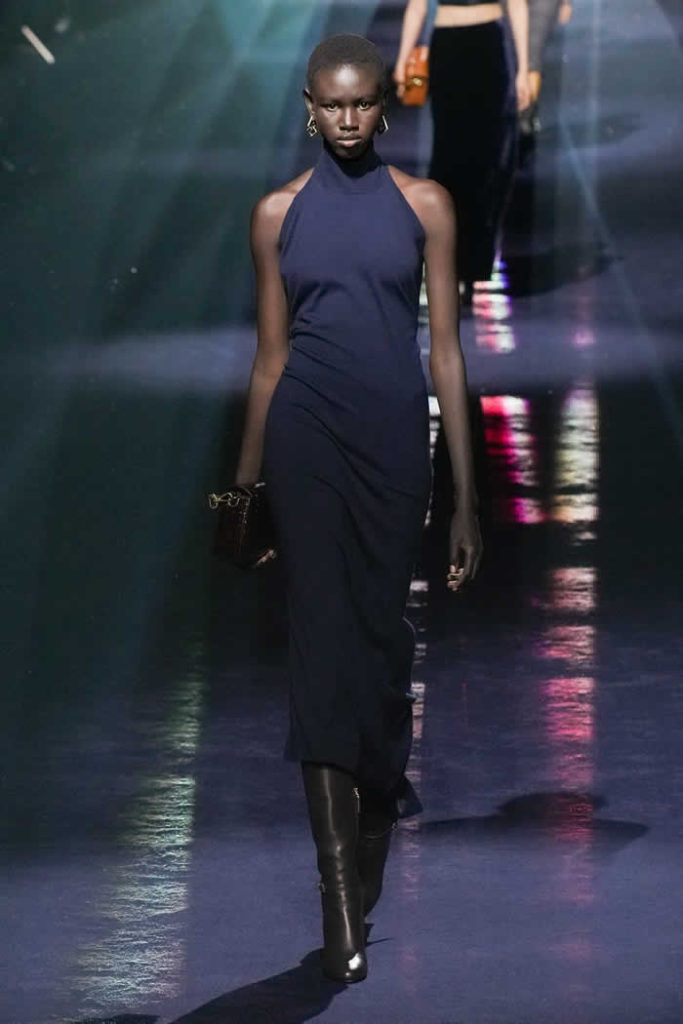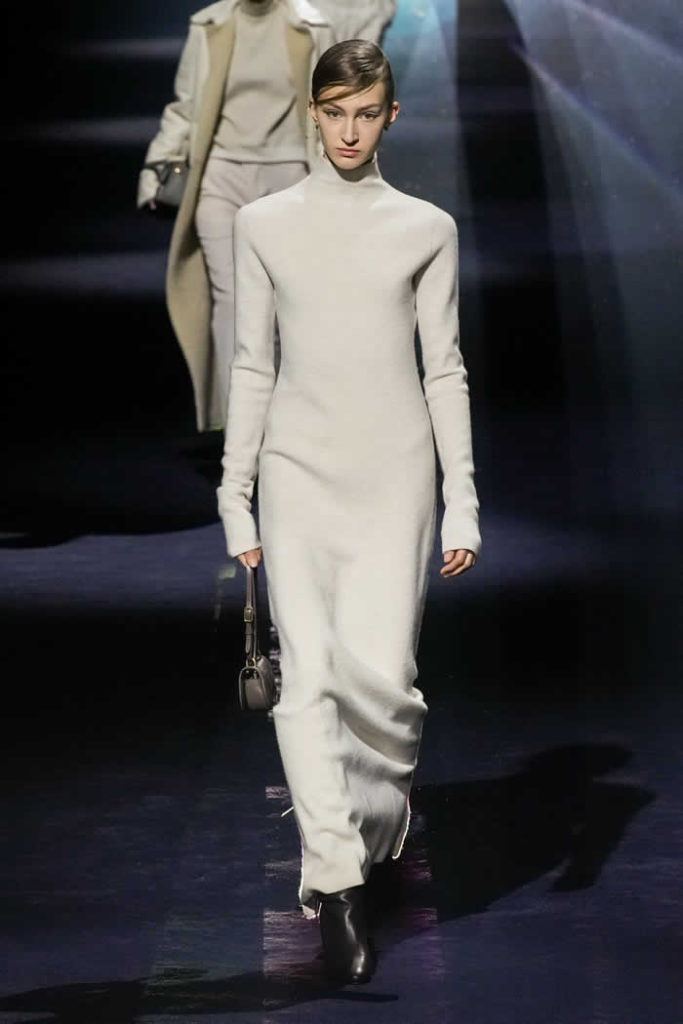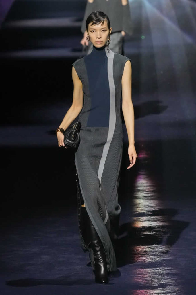 The third ingredient was inspired by Delfina Delettrez Fendi’s personal style, including her interesting combination of brown and pale blue, reflected in the multi-length pleated kilts and black satin suiting. The fourth and final element was the triple-yarned, ribbed knits drawn from Karl Lagerfeld’s fall 1996 collection for the house, contributing to the overall vision of a sophisticated Italian woman with global appeal.