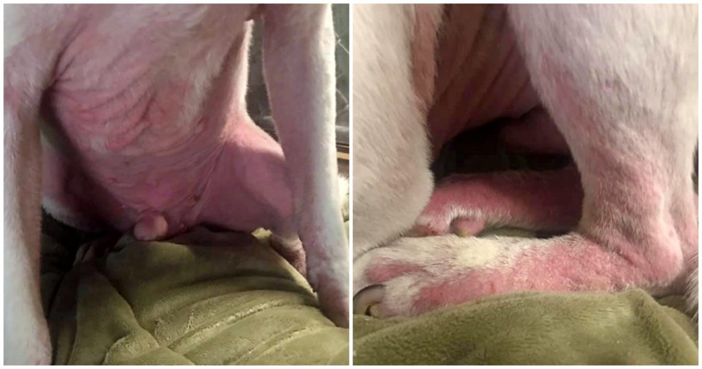 The poor pup was at least 10 to 20 pounds underweight, had demoted mange, overgrown toenails, and had pressure sores from being previously crated for long periods of time. His skin was extremely irritated, most likely from being forced to sit in his own urine and feces in the crate.