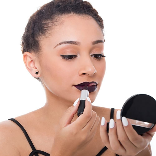 Choose a lip color that complements your complexion. If you’re fair-skinned with a cool undertone, go for a blue-based formula — it shows up more purple on porcelain skin. If you have a darker canvas with a golden undertone, then warmer, brownish shades are ideal for you.