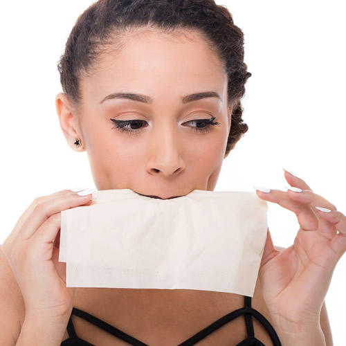 Blot with tissue to tone down shine and give pout a more matte finish. Remember, eyes are light and neutral — a smidgen of liner and mascara is all you need.