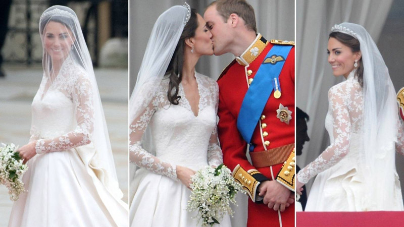 The Princess of Wales looked beautiful in a stunning lace bridal gown created by Sarah Burton for Alexander McQueen on her wedding day. It’s difficult to forget the quirky wedding gown that rocketed Kate into the royal spotlight, with its spectacular 8.85 ft train, lavish lace bodice, and hidden family tributes stitched into the seams.