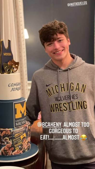 The doting parents presented their son with a three-tier Michigan University celebration cake, complete with photos of Joaquin wrestling and the university’s logo.