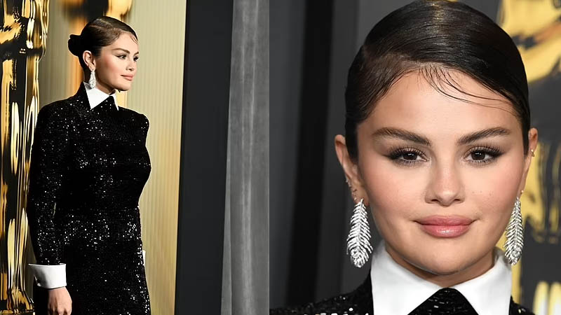 The 32-year-old singer and actress took to Instagram to share glimpses of her dazzling look for the evening. Gomez donned a custom black shimmery dress by Ralph Lauren, featuring white collars and cuffs on the long sleeves, perfectly complemented by silver jewelry and a sleek bun hairstyle.