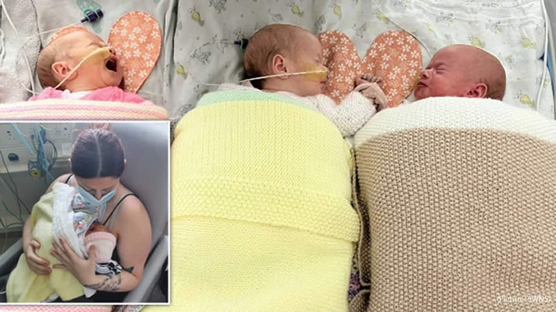 Due to Thea’s tiny size, she had to be rushed away for treatment, but Caitlin and Jake were able to cuddle with the other two girls before they were also taken to the NICU.