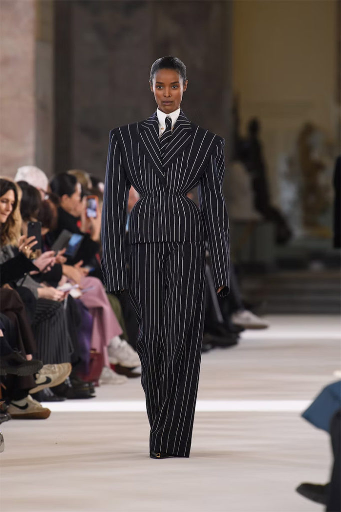 Tuxedos and pinstriped suiting had exaggerated shoulders, nipped-in waists, and super-long slacks; bodices extended far beyond their usual measurements, with some even growing like vines over the models’ faces.