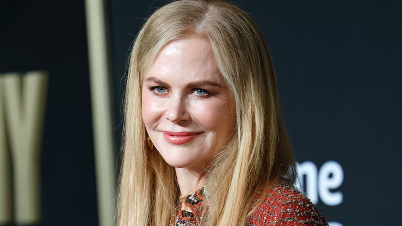 The suit included bootleg pants and a matching collarless jacket with a chevron trim. Underneath the jacket, Kidman opted for a daring choice and wore nothing except for a few chain necklaces, adding an element of intrigue to her classic look.