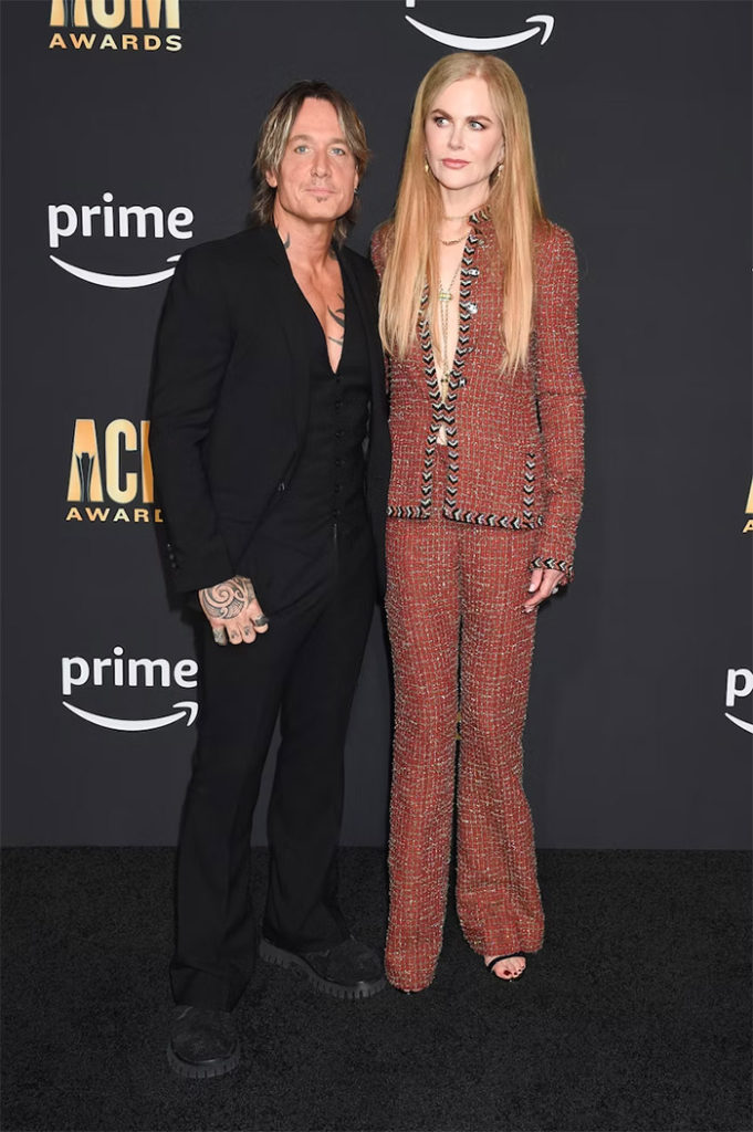 At the event, Kidman posed alongside her husband, Keith Urban, who wore a black suit with a low-cut black vest that mirrored Kidman’s silhouette.
