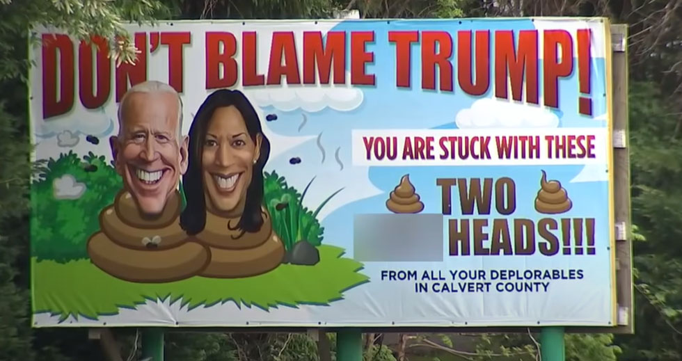 The sign, which is discovered near the junction of Route 4 and Bowie Shop Road in Huntingtown, features a cartoon image of President Joe Biden and Vice President Kamala Harris superimposed on feces.