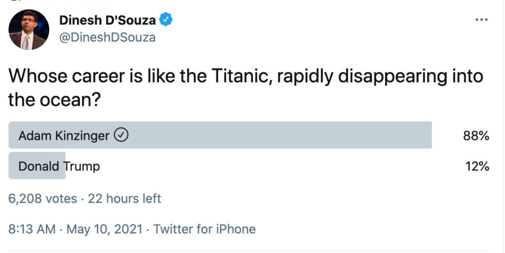 The same thing is going to happen to Kinzinger as well because he can’t keep his globalist yap shut. Now, Kinzinger is claiming that the GOP is the “Titanic” thanks to Trump, and we’re slowly sinking to the bottom of the ocean.