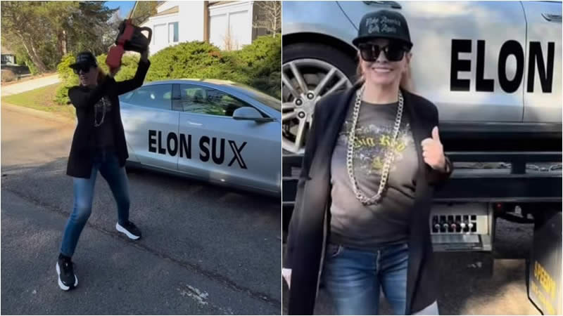 If that wasn’t enough, she took things up a notch in a second video, where she revealed she was officially donating the car. Dressed in a “Make America Goth Again” hat, she channeled peak rock-and-roll energy as AC/DC’s “Highway to Hell” blasted in the background. Wielding a chainsaw—clearly mocking Musk’s bizarre on-stage antics at CPAC—she waved the car away with a smirk before flipping it off for good measure.