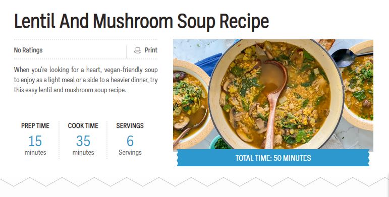 As recipe developer Hayley MacLean describes it, “This soup is full of healthy, delicious ingredients.” The most important ingredient, she says, is the lentils, which she shares are a good source of fiber, protein, B vitamins, and iron. The mushrooms, she tells us, also have vitamin B and fiber, and they contribute vitamin D (the “sunshine vitamin”), something we may not be getting enough of during the darker winter months.Â