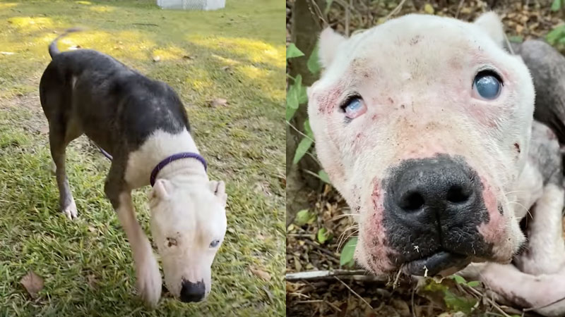 A blind Pit Bull that had been abandoned in the woods ached to be saved but no one showed up. She had given up as she slowly starved. By the time a rescue group found her, she was curled up in a ball trying to stay warm, waiting for her angels to come. One rescuer, from Lucky Dog Refuge, was able to lure her out of the dense woods with food. When she got up, they saw every bone in her body. It was totally soul-crushing.