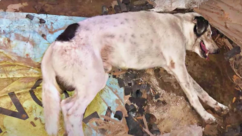 The injured dog found an old abandoned house. He lay in the same spot in the dirty old house for five days, crying out for help or for death to come swiftly. His pain was unimaginable. Finally, someone heard the dog crying and made some calls. A local rescuer arrived at the house and couldn’t believe how much the poor pup was struggling.