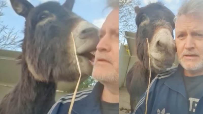 “It seems to happen a lot when you are let out of the run,” the donkey’s owner shares. “Now I’m not saying it’s you, but I’m saying there seems to be a correlation between when you’re free and when the break-ins happen to the feeds shed.” As the man muses over the feed shed caper, suddenly Steve goes in for a cuddle with his dad. Perhaps he is guilty of the crime or maybe the darling donkey is trying to get in his owner’s good graces.