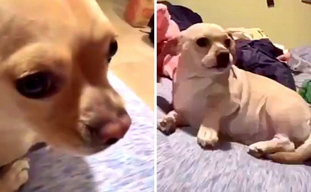 In this video, we see the dog sprawled out on the bed with her signature chunky roly-poly body. Mom cannot control herself and ends up shouting the very 2 words her dog hates – “BOOOOOFY SANDWICH”! The dog looks disturbed by those mocking words and shoots a pretty unforgiving death stare as she warns Mom to zip it!