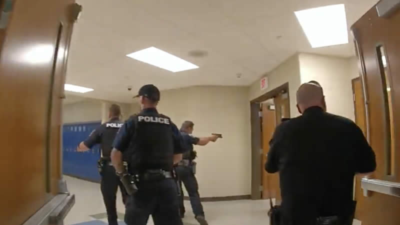 In the video, officers display airsoft guns, pistols, knives, and swords that the boy allegedly showed off to other students. “Right this way, young man,” an officer says as the boy, dressed in casual clothing, is led into an empty cell and locked inside.