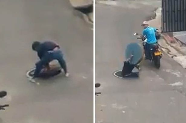 In the clip, the man can be seen lifting up the manhole cover before a biker rides up alongside him and asks him what he is doing.