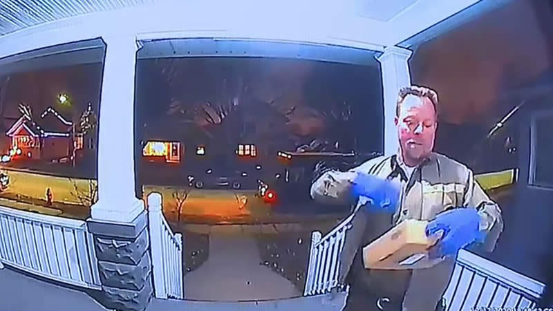 Video caught by the home’s doorbell camera on the evening of Dec. 17 shows a white man wearing a UPS uniform, standing on a porch while holding a package and writing what appears to be a “failed to deliver” notice.