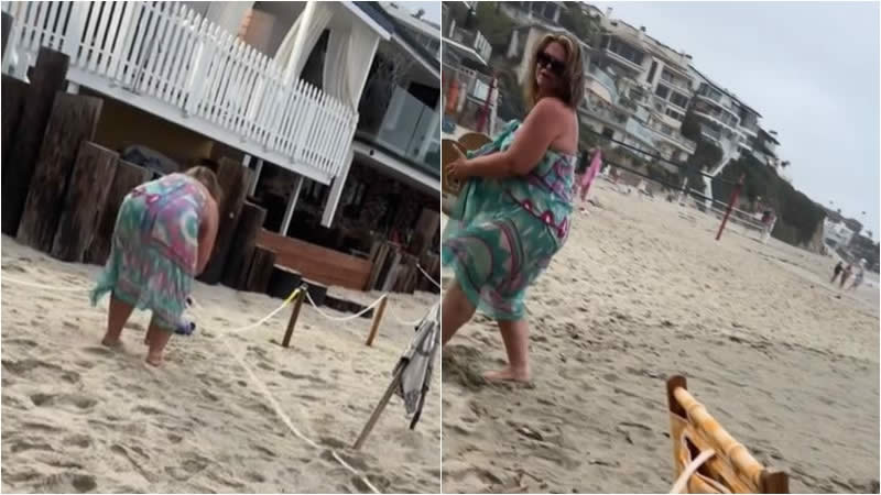 The video begins with the property owner, dressed in a swimsuit and sarong, aggressively shouting at the family. “Get outta here now,” she screams while extending a white rope to demarcate her supposed property boundary onto the sand. The rope and stakes she used had already sectioned off part of the beach adjacent to her property.