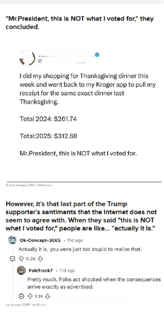 Political frustration, meanwhile, continues to grow. Trump’s critics accuse him of breaking a major campaign promise, while some of his supporters now say they underestimated how quickly policy changes could affect their wallets. The viral post from the Thanksgiving shopper represents a broader shift happening quietly across the country. Voters who once felt confident in their choice are beginning to question it as their everyday expenses rise.