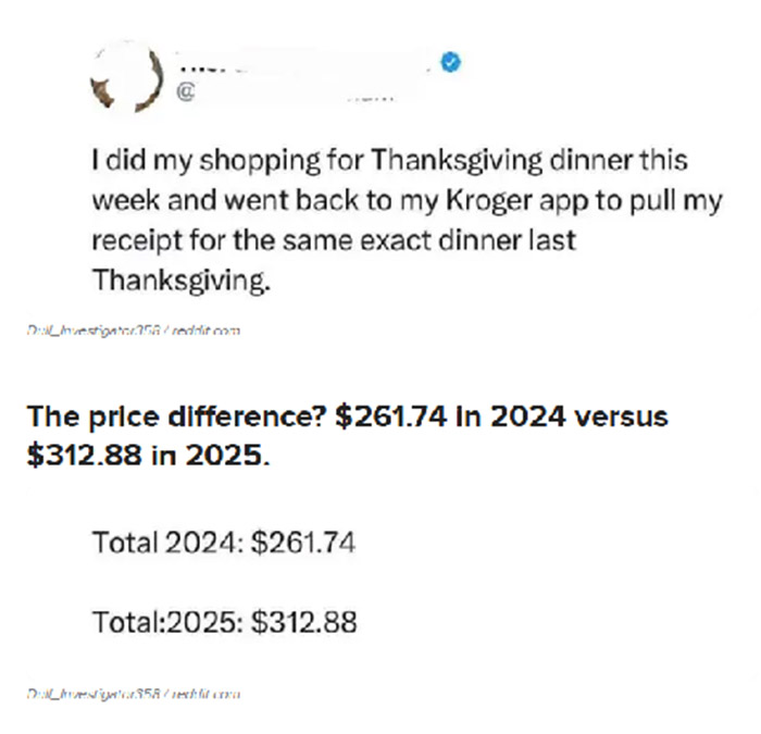 “I did my shopping for Thanksgiving dinner this week and went back to my Kroger app to pull my receipt for the same exact dinner last Thanksgiving,” they wrote.